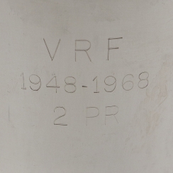 Высота: 8,5 см, диаметр верха: 7,3 см. Объём: 250 мл. Вес: 57 граммов серебра 830 пробы.