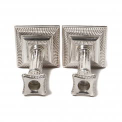 Высота: 17,5 см, размер основания: 9,5 х 9,5см, диаметр отверстия для свечи: 1,8 см. Общий вес с утяжелением: 616 граммов, серебро 830 пробы. ============================= Silver candlesticks in the form of Corinthian columns, 2 pcs.