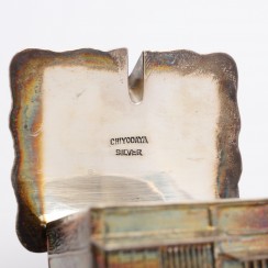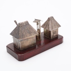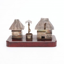 Набор для специй, серебро 925 пробы, дерево. Япония. Максимальная высота 6,5 см, длина 12,3 см, ширина 5,8 см ---------------- У емкости со стеклянной вставкой, выполненной в виде домика, снимается крыша, которая служит в качестве отдельной солонки. По сути, это две солонки для разной соли (крупного и мелкого помола). Высота "домика" 4,8 см. Высота по край емкости (без съемной крыши) 2,5 см, размеры стеклянной вставки: высота 2,4 см, диаметр 2 см. Размеры солонки в виде крыши: высота 2,6 см, длина 3,8 см, ширина 3,3 см. ---------------- Высота перечницы, выполненной в виде колодца: максимальная высотавысота 4,7 см, высота по край 1,5 см, диаметр 1,7 см. ---------------- Высота перечницы, выполненной в виде домика с откидной крышкой, 5 см, размеры стеклянной вставки: высота 2,5 см, диаметр 2,4 см. ------------- Длина дожек 5,8 см.