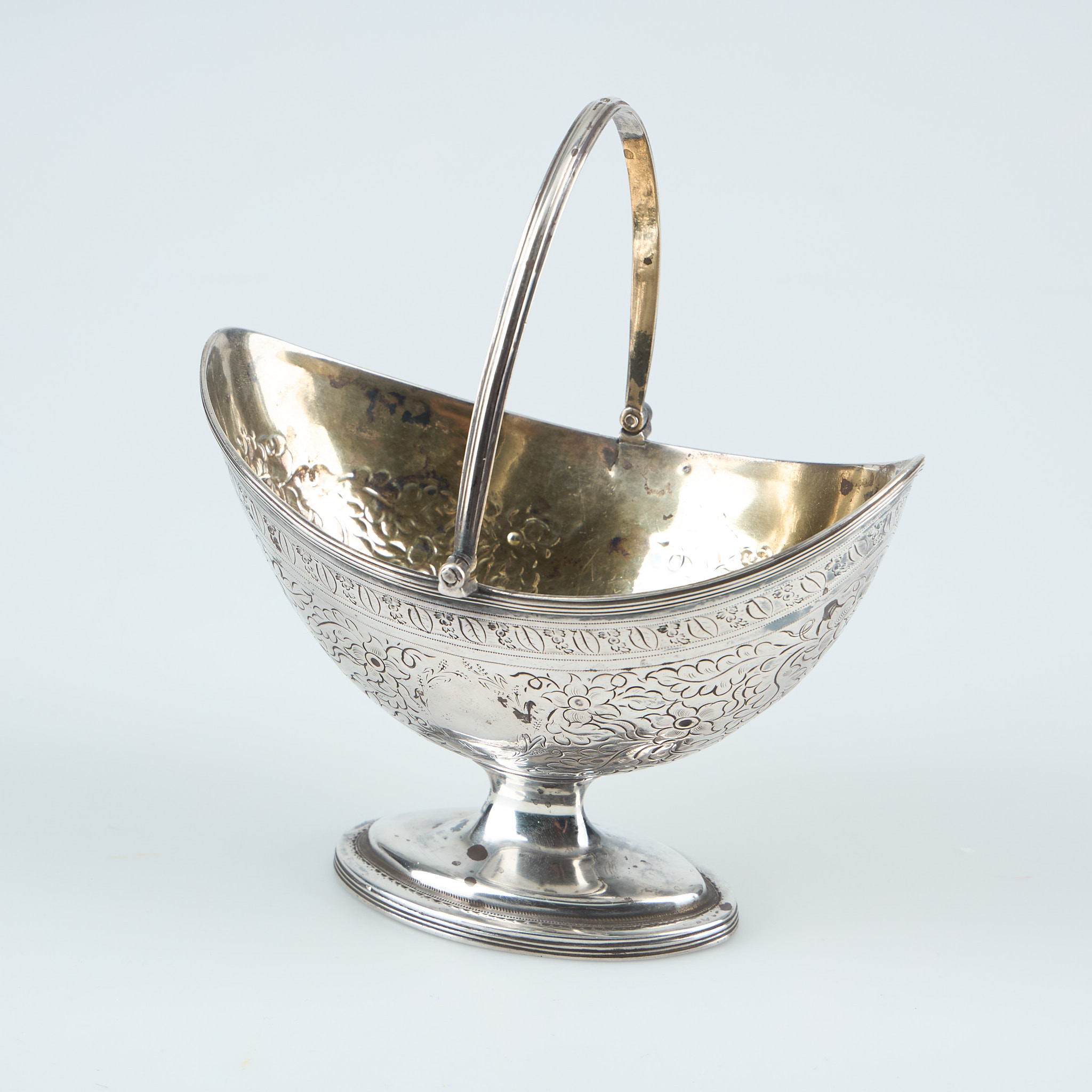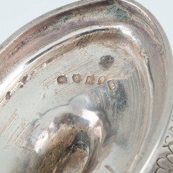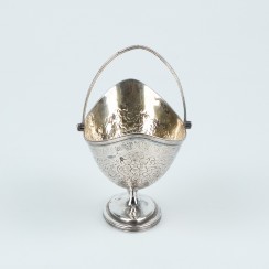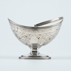 Ваза с перекидной ручкой, Англия, конец 18 века, 220 гр, 925 пр Максимальна высота по край чаши 11,2 см, длина чаши 15,5 см, ширина 9,5 см; высота по верх поднятой ручки 17,5 см; размеры основания 9 х 5,6 см Небольшая вмятинка на боку, трещинка в районе препления ручки