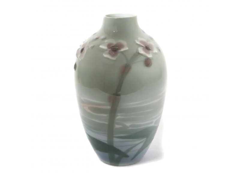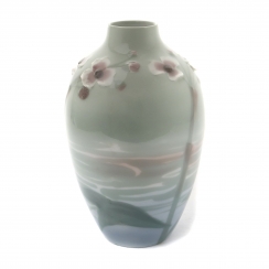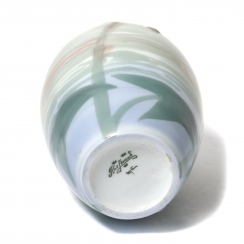 Без сколов, повреждений и без реставраций. ================================= Unique porcelain vase, modern. The vase is decorated with a soft, flowing design in pastel tones. The surface features hand-painted imagery resembling a calm water surface with reflections and subtle botanical elements. The lower part shows large leaves and stems rendered in shades of green and blue. The upper section includes small, raised floral motifs covered with glaze. The overall decoration is executed in muted hues of green, blue, and pink, creating a serene, nature-inspired composition. Hand-painted underglaze on relief.