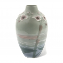 Уникальная фарфоровая ваза, модерн. Ваза декорирована мягким, плавным рисунком в пастельных тонах. На поверхности выполнена художественная роспись, изображающая водную гладь с отражениями и растительные мотивы. В нижней части просматриваются крупные листья и стебли, выполненные в зелёно-голубой гамме. В верхней зоне композиции присутствуют рельефные элементы в виде небольших цветков, покрытые глазурью. Общий декор выполнен в приглушённых оттенках зелёного, синего и розоватого, создавая впечатление природного, спокойного пейзажа. Ручная подглазурная роспись по рельефу.