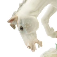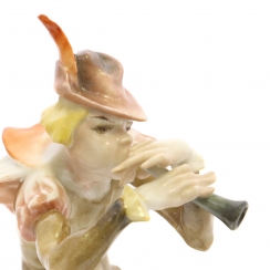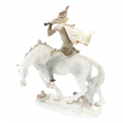 Фарфоровая фигура (статуэтка) "Всадник-трубач на коне" (Трубач). Фигура изображает трубача XVIII века на белой лошади в движении: всадник с развевающимся плащом играет на трубе, одет в камзол и шляпу с пером, при этом обе ноги босые. Ручная роспись.