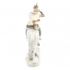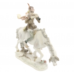 Без сколов, повреждений и без реставраций. ============================== Porcelain figurine "Horn Player on Horse" ( Trompeter). The figure depicts an 18th-century trumpeter on a white horse in motion: the rider, with a flowing cloak, plays the trumpet, dressed in a doublet and a hat with a feather, while both feet are bare. Hand-painted.