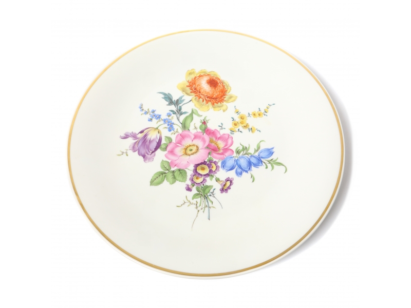 Тарелка третьего сорта. Без сколов, реставраций и повреждений. ============================ Porcelain wall plate (dish). The center of the plate features a hand-painted, realistic bouquet of wildflowers using the polychrome overglaze technique known as the "Meissen Bouquet." The rim is decorated with a fine gold border. Hand-painted.