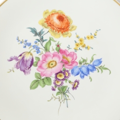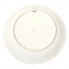 Фарфоровая настенная тарелка (блюдо). В центре тарелки — вручную расписанный реалистичный букет полевых цветов в полихромной надглазурной технике («Мейсенский букет»). Ободок украшен тонкой золотой отводкой. Ручная роспись.