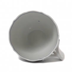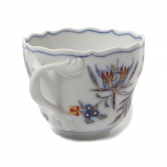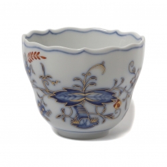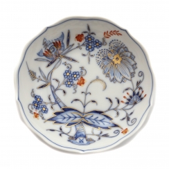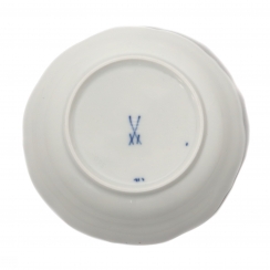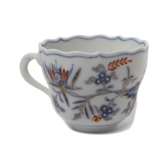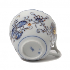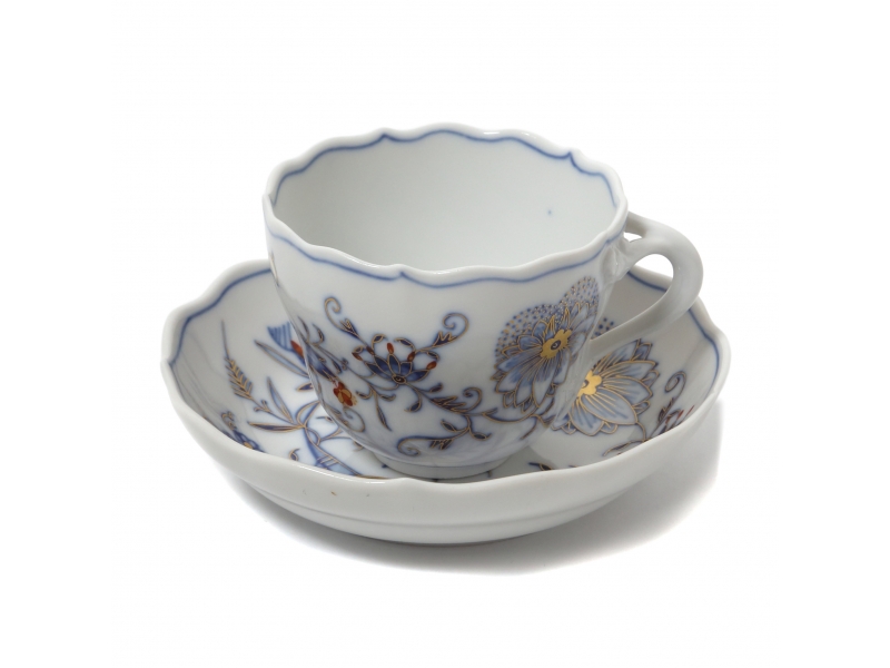 Фарфоровая кофейная чашка с блюдцем. Чашка и блюдце имеют волнистые, фестончатые края. Дизайн "Голубой лук" (Blue Onion) был создан в 1739 году. Ручная роспись.