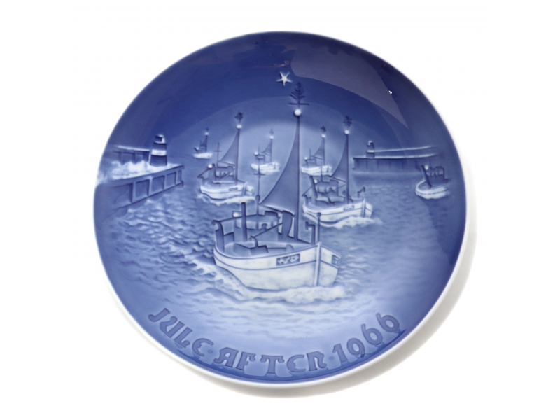 The plate depicts fishing boats decorated with small Christmas trees, returning to the harbor under a starry night sky, symbolizing the return home for Christmas.
