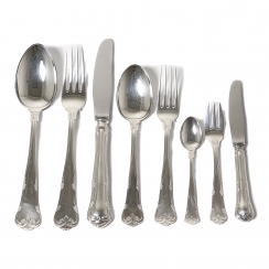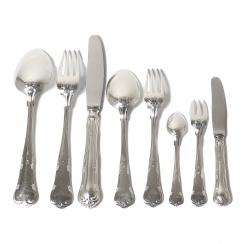 Individual cutlery, 48 pieces: Dinner spoons, 6 pieces, length: 20.2 cm Dinner forks, 6 pieces, length: 20.7 cm Dinner knives, 6 pieces, length: 22.5 cm Lunch spoons, 6 pieces, length: 17.8 cm Lunch forks, 6 pieces, length: 17.8 cm Teaspoons, 6 pieces, length: 12 cm Dessert forks, 6 pieces, length: 13.5 cm Dessert knives, 6 pieces, length: 16.5 cm