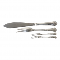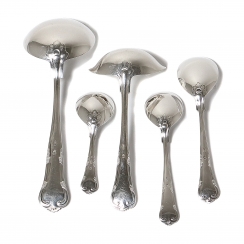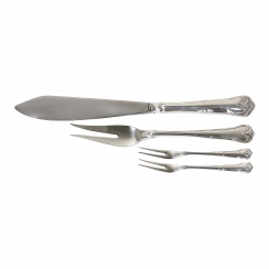 Serving utensils, 9 pieces: Ladle, length: 20.2 cm Sauce ladle, length: 15.5 cm Serving spoons, 3 pieces, length: 15.3 cm 13.7 and 10.5 cm. Meat fork, length: 20 cm. Pie knife, length: 26.5 cm. Serving forks, 2 pcs, length: 12 cm.