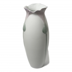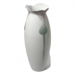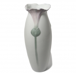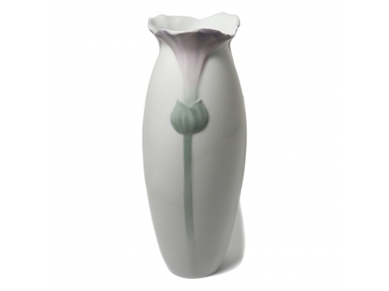 Уникальная фарфоровая ваза, модерн. Тулово украшено изящным рельефным стеблем с бутоном, а само горлышко плавно переходит в форму раскрывающегося цветка. Ручная подглазурная роспись по рельефу.