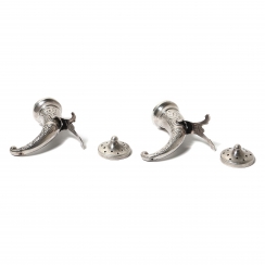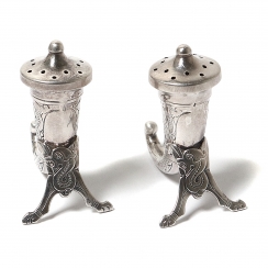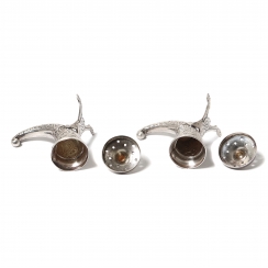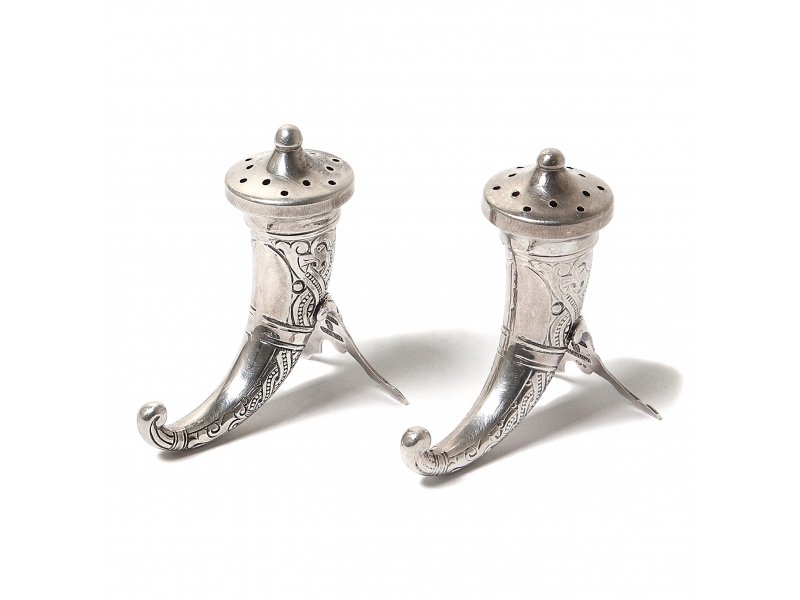 Высота: 5,5 см, длина: 6 см. Общий вес: 34 грамма серебра 925 пробы. ================================ Silver salt and pepper shaker in the form of rhytons.