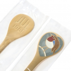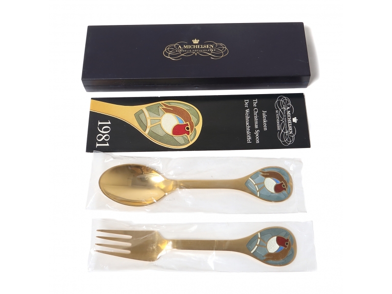 Клеймо дизайнера. «A.MICHELSEN Sterling Danmark» - клеймо, удостоверяющее, что изделие произведено в датской мастерской Антона Михельсена, поставщика Датского королевского двора, из стерлингового серебра. С 1910 года именитый датский производитель столового серебра A.Michelsen выпускает каждый год так называемую Christmas Spoon, а также десертные наборы, состоящие из ложки и вилки, которые традиционно датчане, да и не только, включают в рождественские подарки близким. Авторами дизайна становятся наиболее именитые датские дизайнеры, художники, скульпторы. ================================================ The Danish сollection dessert spoon and fork "Robin Redbreast". Silver, gilding, enamel.
