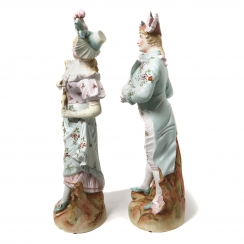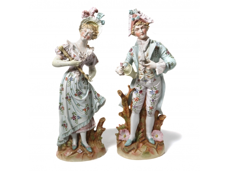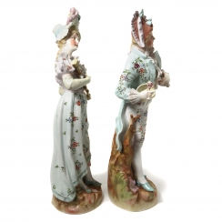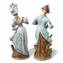 У кавалера отколот кончик банта на голове, у девушки отколот нижний конец посоха, сколы на ребре основания.