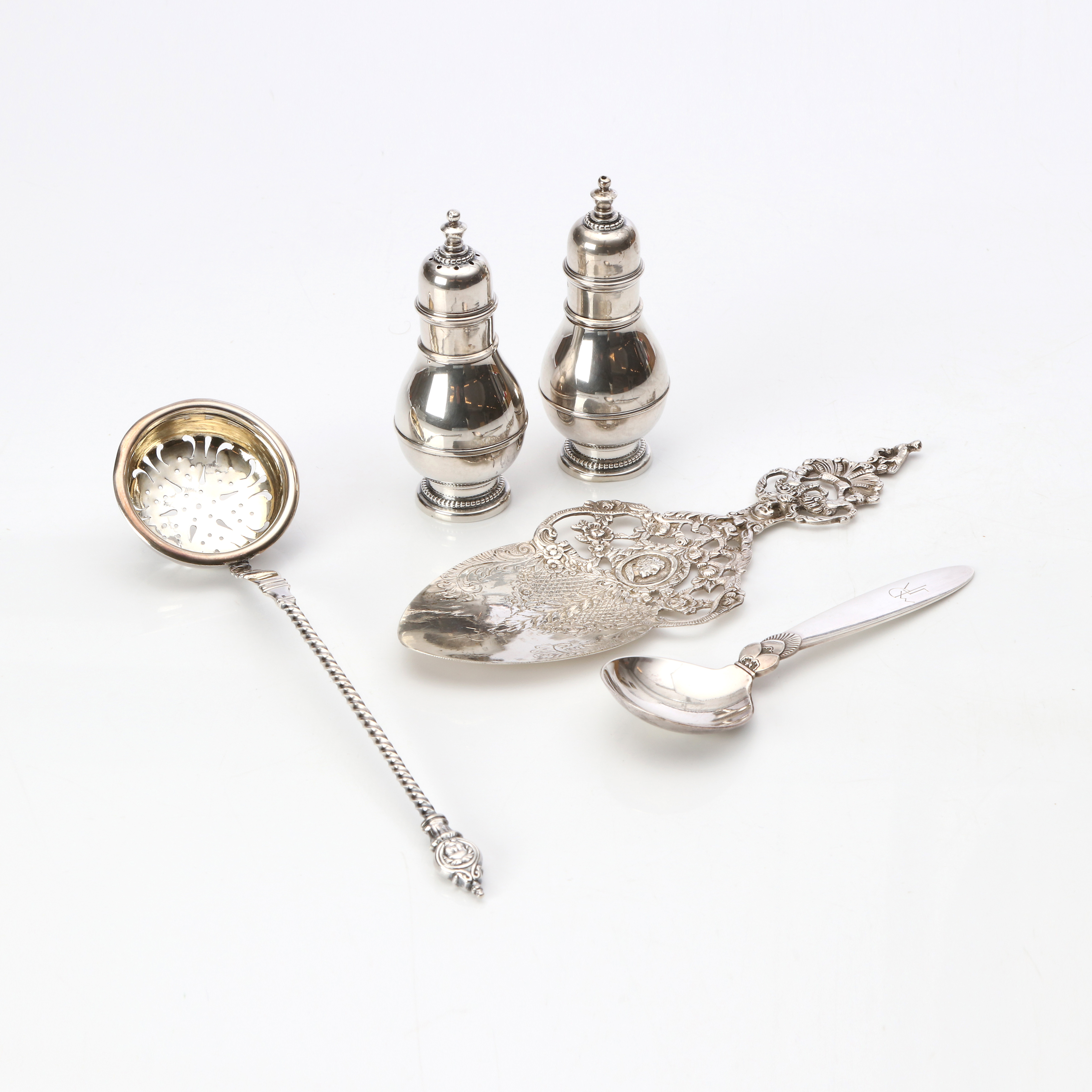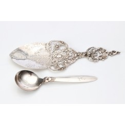 ![]() 332765 - Серебряная сервировочная лопатка. Ввезена в Швецию.Серебряная сервировочная лопатка.Ввезена в Швецию, первая половина 20 века. Государственное пробирное клеймо Швеции для ввезенных серебряных изделий. Длина: 19,3 см. Вес: 57 граммов серебра 830 пробы. ======================== Silver cake pie server (spatula). Was imported to Sweden, first half of the 20th century. Length: 19.3 cm. Weight: 57 grams of silver 830 fineness. ![]() 387911 - Серебряная солонка и перечница. |