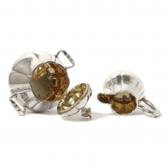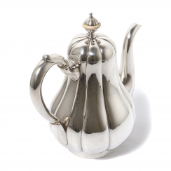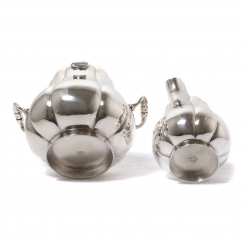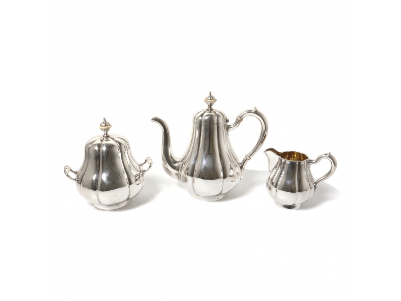 Трехзначное пробирное российское клеймо в овале 1899-1908 гг. - "женская голова в кокошнике, обращенная влево" с цифрой "84" и буквами "ЯЛ", где: "женская голова в кокошнике, обращенная влево" - знак удостоверения; цифра "84" удостоверяет, что изделие выполнено из серебра 84 пробы; буквы "ЯЛ" - инициалы пробирного мастера Ляпунова Якова Николаевича (годы работы: 1898-1903). ======================== Silver tea and coffee set, 4 items.