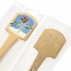 Клеймо дизайнера. «A.MICHELSEN Sterling Danmark» - клеймо, удостоверяющее, что изделие произведено в датской мастерской Антона Михельсена, поставщика Датского королевского двора, из стерлингового серебра. С 1910 года именитый датский производитель столового серебра A.Michelsen выпускает каждый год так называемую Christmas Spoon, а также десертные наборы, состоящие из ложки и вилки, которые традиционно датчане, да и не только, включают в рождественские подарки близким. Авторами дизайна становятся наиболее именитые датские дизайнеры, художники, скульпторы. ================================== The Danish сollection annual dessert spoon and fork "Christmas rose". Silver, gilding, enamel.