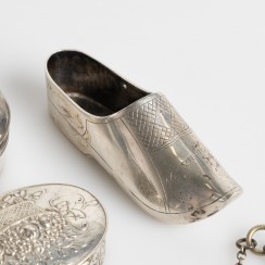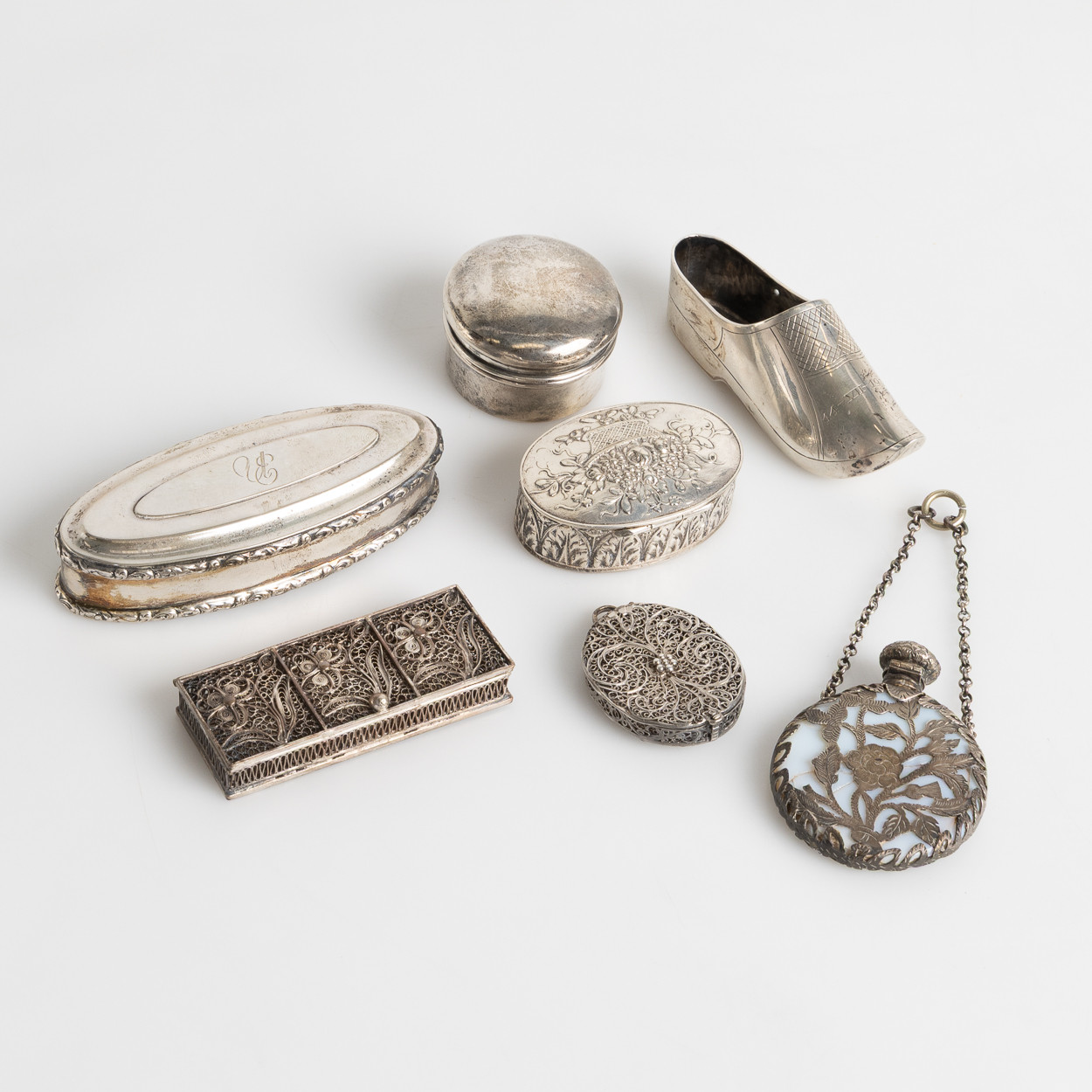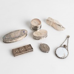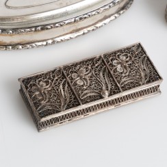 Информация о лоте 398780 - Ваза - игольница в виде туфельки, Голландия, 63 гр, 833 пр, длина 8,5 см, ширина 3 см, высота 3,4 см 317475 - Таблетница, 42 гр, 830 пр, 5,5 х 3,5 х 2,3 см 292583 - Таблетница, 14 гр, 925 пр, диаметр основания 3,9 см, максимальная высота 3,2 см 234862 - Небольшая коробка или таблетница, 63 гр, 830 пр, длина 9,6 см, ширина 4 см, высота 2,5 см 297249 - Таблетница, филигрань, 29 гр, 7 х 3 х 1,4 см 347964 - Подвеска-коробочка, филигрань, 12 гр, размеры без кольца 4 х 3,4 х 0,7 см 345606 - Флакон, стекло, серебро, общий вес 40 гр |