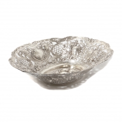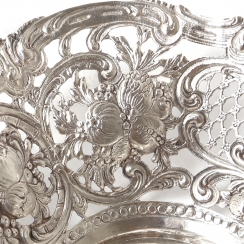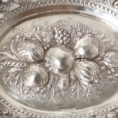 Максимальная длина: 25 см, ширина: 21 см, высота: 6 см. Вес: 373 грамма серебра 835 пробы. ========================= Silver open-work bowl, decorated with a relief floral pattern and fruits.