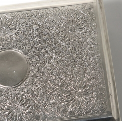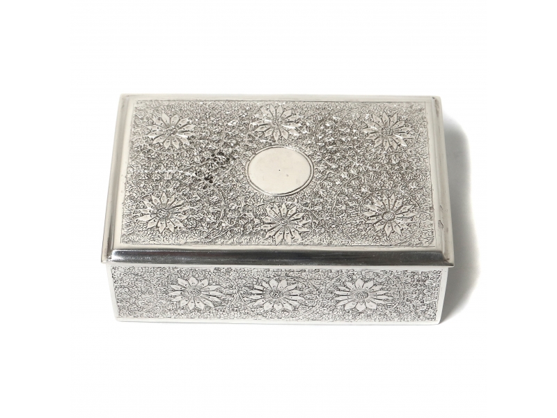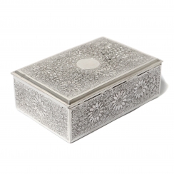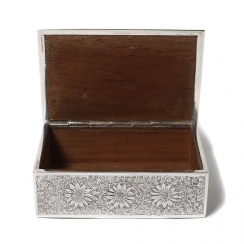 Серебряная коробка (шкатулка) с деревянным дном и внутренней деревянной отделкой, декорирована растительным узором.