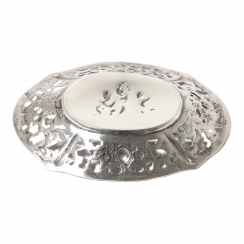Размеры: 10,8 х 7,5 х 1,5 см. Вес: 50 граммов серебра 800 пробы. ========================= Silver open-work bowl (dish) decorated with a floral ornament and putti.