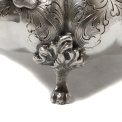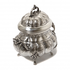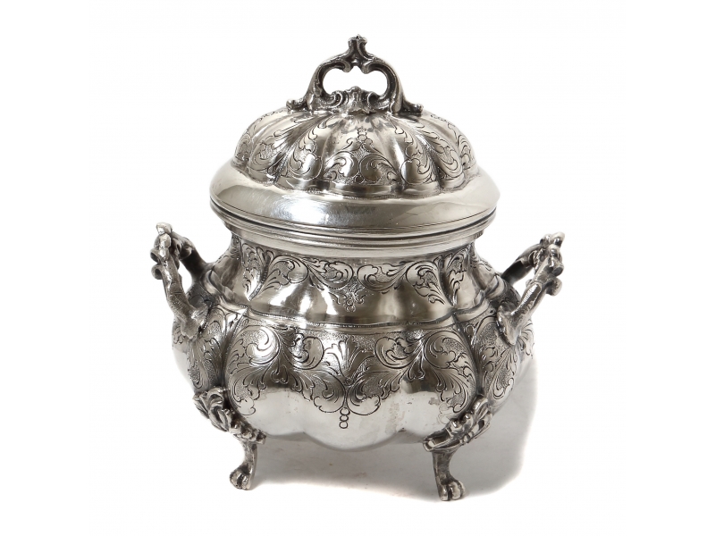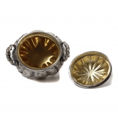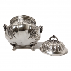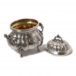 Серебряная сахарница, Сахарница округлой формы с крышкой, украшена растительным орнаментом. Имеет фигурные боковые ручки в виде листьев и завитков, декоративные ножки и изящную ручку на крышке.