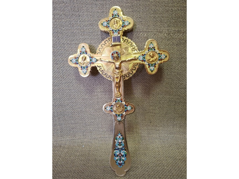 335593 - Напрестольный крест. Серебро, позолота, эмаль. Российская империя (Россия), 1908-1917 гг, 453 гр. Длина 34 см, ширина 20 см
