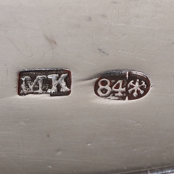 "МК" - the mark with initials of silversmith Kilpelein Mathias Heinrich (born 1831 in Finland, worked since 1850 to 1898).