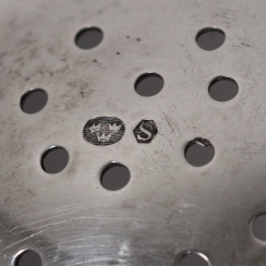 The stand is made in Sweden, Malmo, year 1949, workshop Gewe Silvervarufabriken (worked since 1939 to 1984). The strainer was made in Holland, was imported to Sweden, first half of the 20th century.