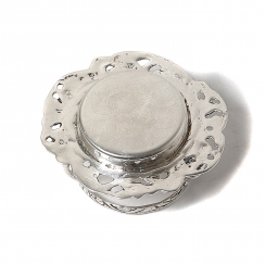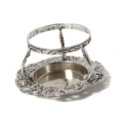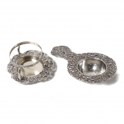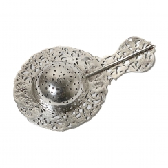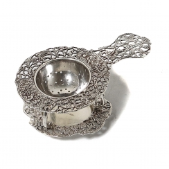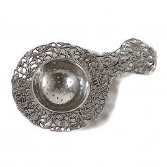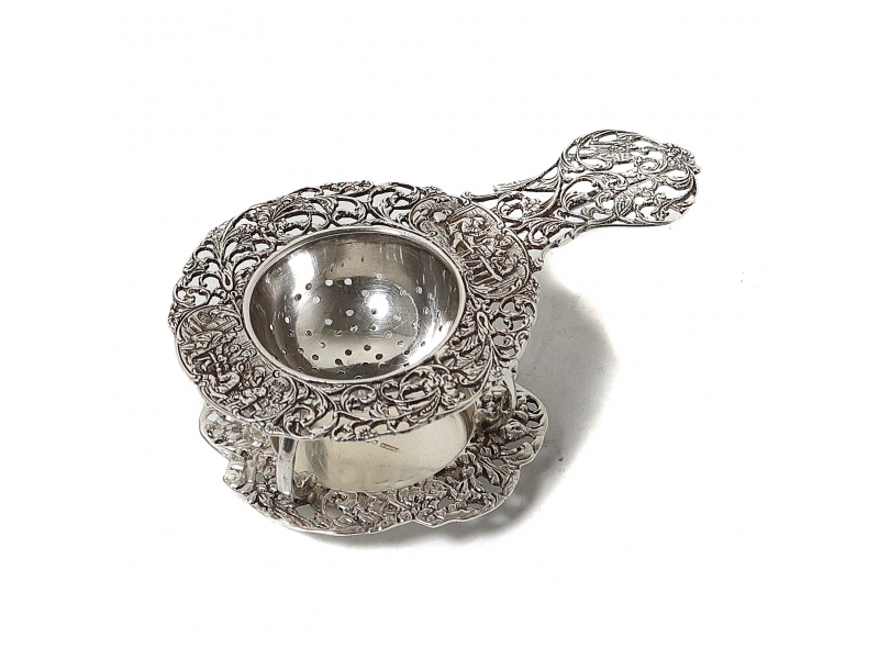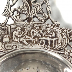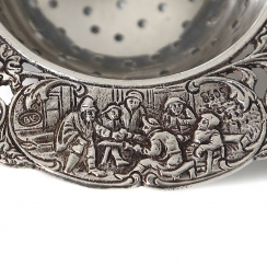 Серебряное ситечко для чая на подставке, декорированное растительным орнаментом и сюжетными миниатюрами.