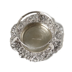 Высота в сборе: 4,3 см, длина: 12 см, внешний диаметр: 7,3 см. Общий вес: 83 грамма серебра 830 пробы. ============================ Silver tea strainer with drip bowl, decorated with floral ornaments and narrative miniatures.