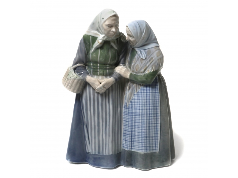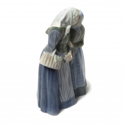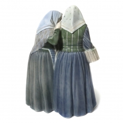 Статуэтка третьего сорта. Не обнаружил каких-либо очевидных производственных дефектов, повлиявших на сортность изделия, вероятно, статуэтки присвоили третий сорт из-за нюансов раскраски. Без сколов, повреждений и реставраций. ============================ Porcelain figurine "The Gossip". Hand-painted underglaze.