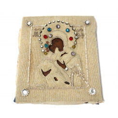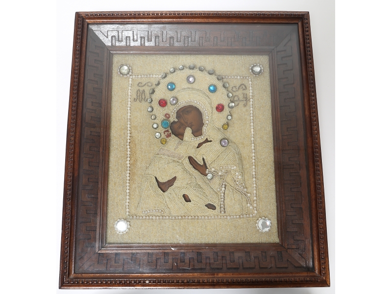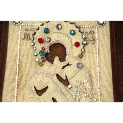 Икона "Божья Матерь Владимирская" в окладе из бисера в киоте.