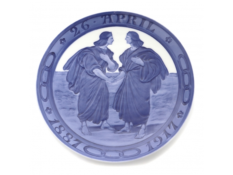 Тарелка "Двое мужчин приветствуют друг друга", 1917 год, диаметр 20,2 см, высота 2,7 см, RC_ На полях надпись "16 April 1887-1917" Выпущена по заказу Независимого Ордена Чудаков. --- Независимый Орден Чудаков, также известный как Братство Тройного Звена, - это международная благотворительная организация, основанная в 1819 году, которая осуществляет помощь нуждающимся.