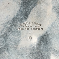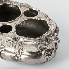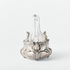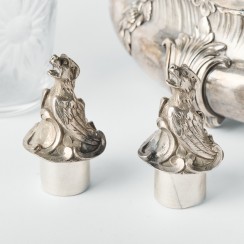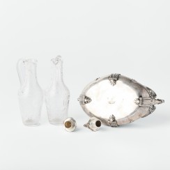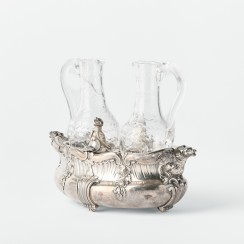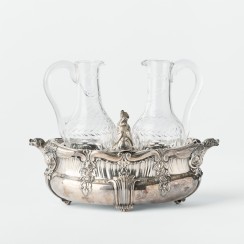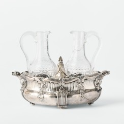 Круэт: два стеклянных графина в серебряной подставке. Франция. Вес подставки и двух серебряных крышек 1120 гр, 950 пр. Максимальная длина подставки 24,5 см, ширина 14,5 см, высота по верх боковых ручек 9,2 см Максимальная высот графинов (по верх крышек) 22,8 см, высота по край горла 18,3 см, диаметр основания 4,8 см, диаметр горла 3,4 см У одного из графинов трещина на горле
