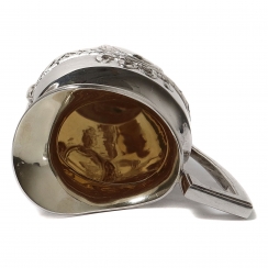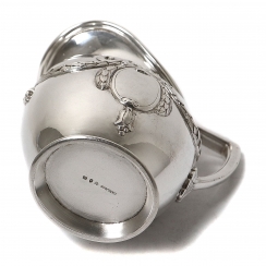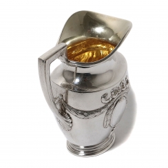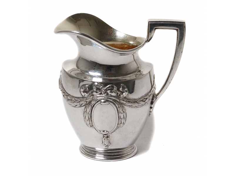 Небольшой серебряный кувшин (молочник). Центральная часть тулова кувшина украшена рельефным лавровым венком, перевязанным лентами. Внутри венка расположен картуш овальной формы.