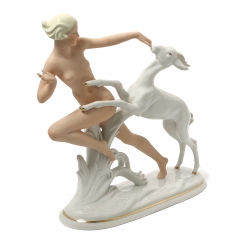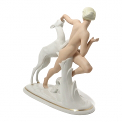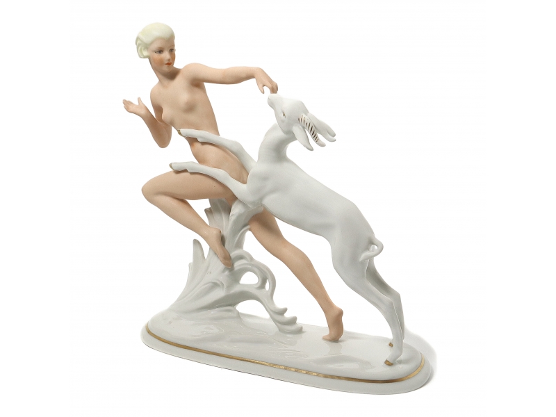 Фарфоровая фигура (статуэтка) "Обнаженная девушка с газелью". Ручная роспись.