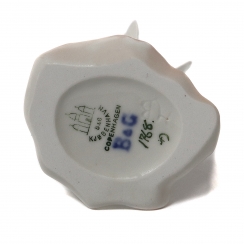 Дания, г. Копенгаген, Bing & Grondahl. Дизайнер и модельер: Harriet Bing (годы жизни: 1863–1919). Номер модели: 1768. Инициалы художника, расписавшего статуэтку. Клеймо производителя: 3 towers B&G Kjobenhavn, Copenhagen, B&G, 1914-1915 гг.