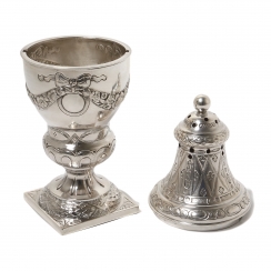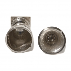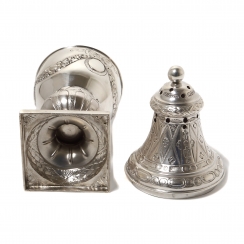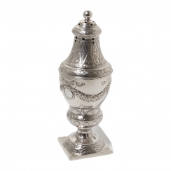 Высота: 21 см, размер основания: 6,5 х 6,5 см. Вес: 239 граммов серебра 826 пробы. =========================== Silver sugar shaker castor, decorated with a flower garland.