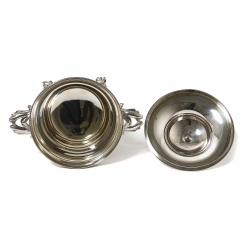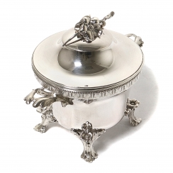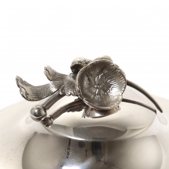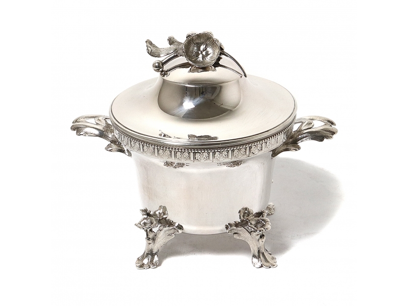 Серебряная сахарница, стоит на четырех ножках в форме листьев, украшенных цветочными мотивами. Аналогичные цветочные элементы присутствуют на ручках и на ручке крышки.