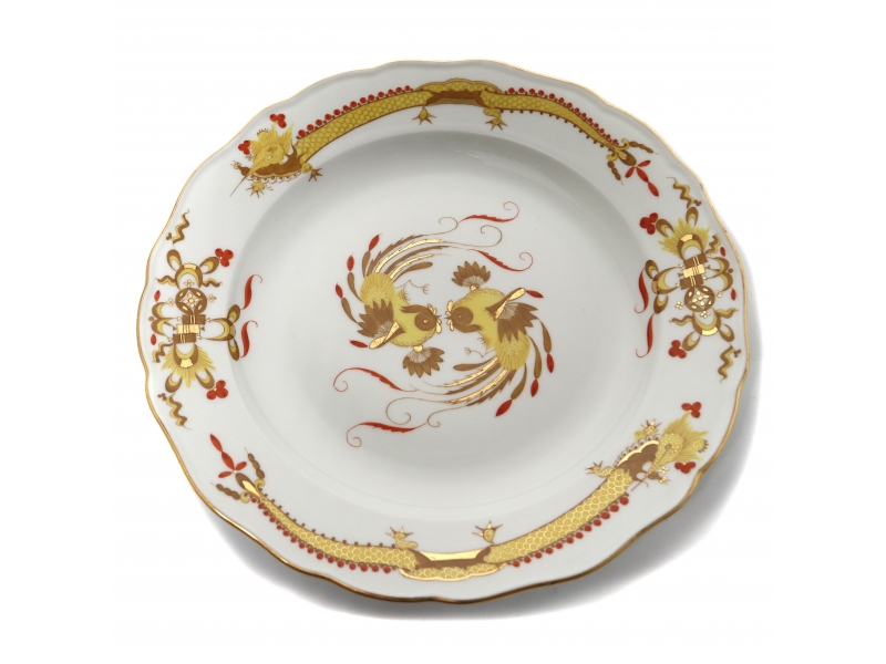 Без сколов, реставраций и повреждений. ============================ Porcelain plate. Hand-painted in an oriental style, the composition consists of two long-bodied dragons with golden scales, flying around a pair of phoenixes, located in the center of the plate's mirror. Pattern "Rich Court Dragon Yellow" (Court Dragon). Hand-painted.