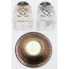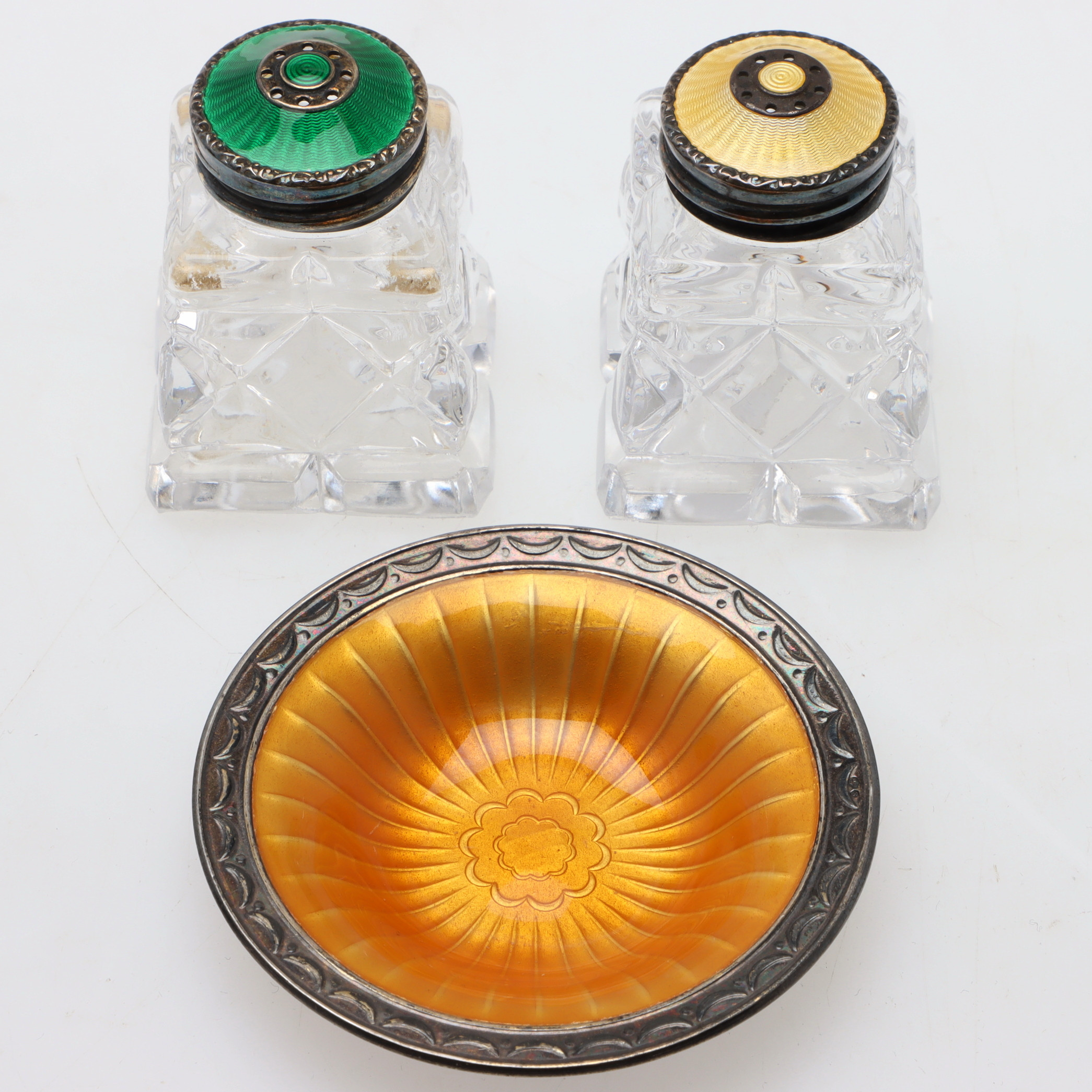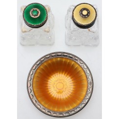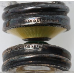 ![]() 373197 - Розетка. Стекло, серебро, эмаль. НорвегияРозетка.Стекло, серебро 925 пробы, эмаль по гильоше. Норвегия, г. Осло, мастерская N.M. Thune (годы работы: 1857-1984). Высота: 1 см, диаметр: 5,8 см. Вес: 16 граммов серебра 925 пробы. Эмаль без сколов. =========================== Jam dish (bowl, coaster). Glass, sterling silver of 925 fineness, guillash enamel. Norway, Oslo, workshop N.M. Thune (worked since 1857 to 1984). Height: 1 cm, diameter: 5.8 cm. Weight: 16 grams of sterling silver 925 fineness. Enamel without chips. ![]() 376290 - Солонка и перечница. Стекло, серебро 925 пробы, эмаль. Общий вес серебряных крышек 7 гр. Высота 4,3 см, основание 3,2 х 3,2 смна обратной стороне крышек коррозийные пятнышки |