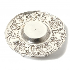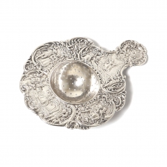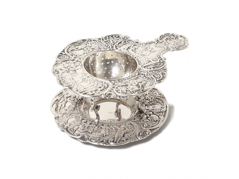 Общий вес: 158 граммов серебра 830 пробы. ============================ Silver tea strainer with drip bowl, decorated with floral ornaments and narrative miniatures.