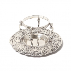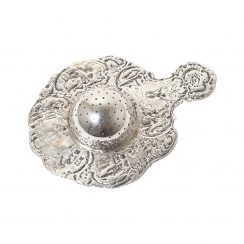 Серебряное ситечко для чая на подставке, декорированное растительным орнаментом и сюжетными миниатюрами.