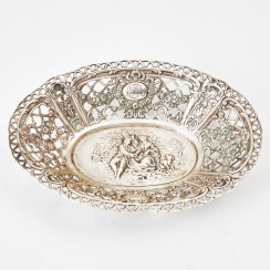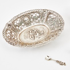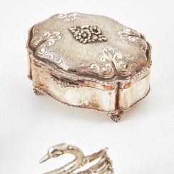 Информация о лоте 367204 - Шкатулка, 184 гр, 830 пр, максимальные размеры 10,7 х 8,5 х 6,4 см 304297 - Прорезная ваза, 93 гр, 830 пр, 17,5 х 13 х 3 см 313882 - Солонка в виде лебедя с ложкой. Стекло, серебро 835 пробы. |