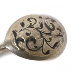 Пробирные российские клейма до 1899 года, где: цифра "1856" указывает год клеймения; цифра "84" удостоверяет, что изделие выполнено из серебра 84 золотниковой пробы; ============================ Silver tea spoon. Gilding, niello.