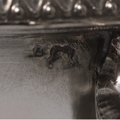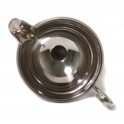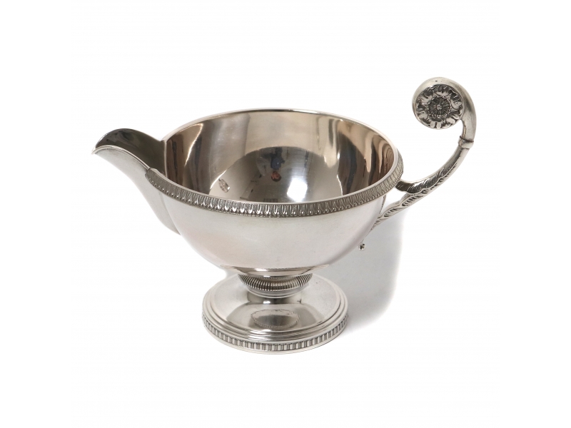 Высота по край: 7,5 см, диаметр основания: 6 см, диаметр верха: 9,8 см. Объём: 140 мл. Вес: 192 грамма серебра 800 пробы. ========================== Silver creamer (milk jug).