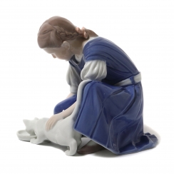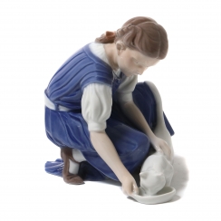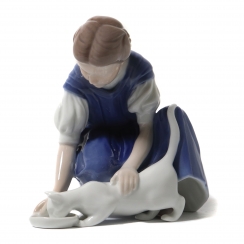 Фигура производилась также после объединения фабрик Royal Copenhagen и Bing & Grondahl (1985-1989) под брендом Royal Copenhagen, номер модели: 421. ============================= Porcelain figurine "Girl feeding cat". Hand-painted underglaze. "Only one drop" by Pope's catalog. Denmark, Copenhagen, Bing & Grondahl. Sculptor: Ingebord Plockroos Irminger (years of life: 1872-1962). Model: 1745. The initials of the artist painted this figurine: ES . Factory mark: 3 towers B&G Kjobenhavn Denmark, the 1962-1970.