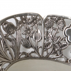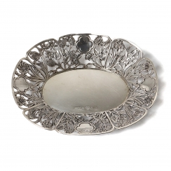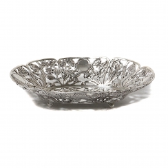 Длина: 14,4 см, ширина: 11 см, высота: 3 см. Вес: 111 граммов серебра 830 пробы. ========================= Silver open-work bowl (dish) from series the "Flowers of Sweden".