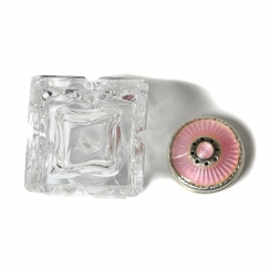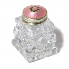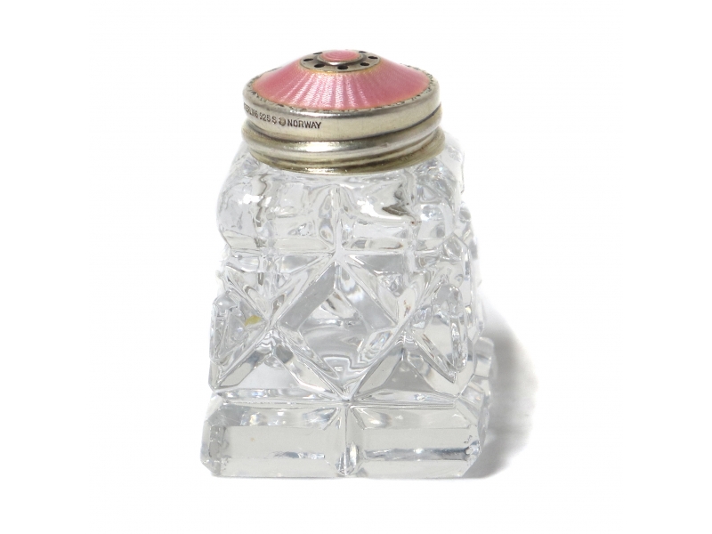На гранях стекла несколько микросколов. =========================== Salt shaker. Glass, sterling silver of 925 fineness, pink guillash enamel.
